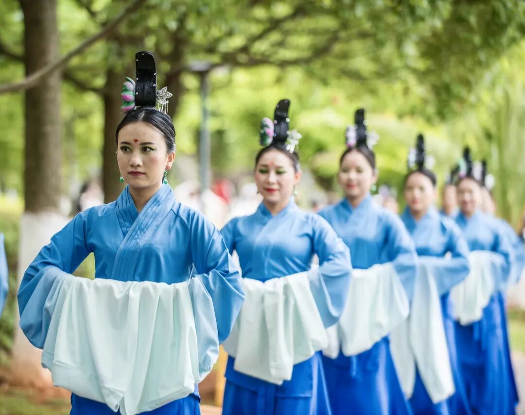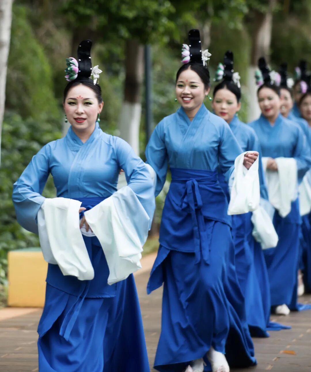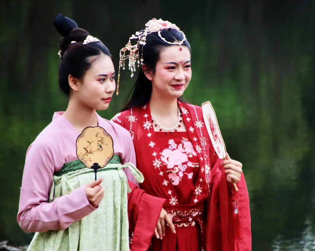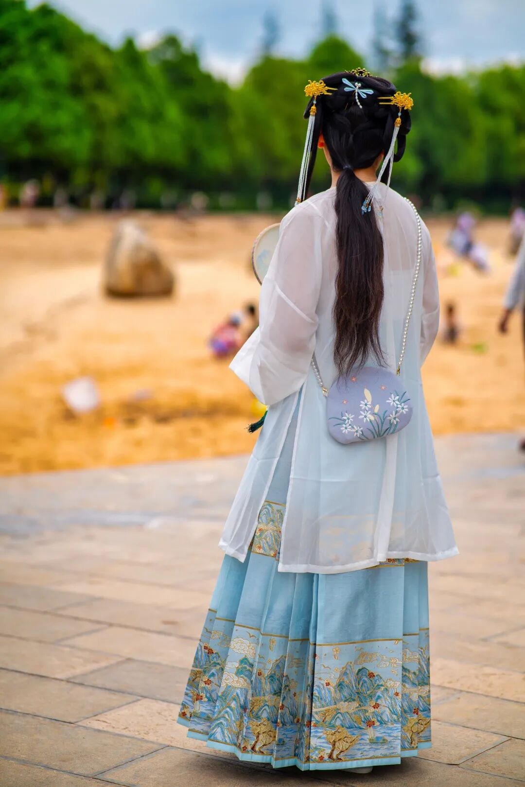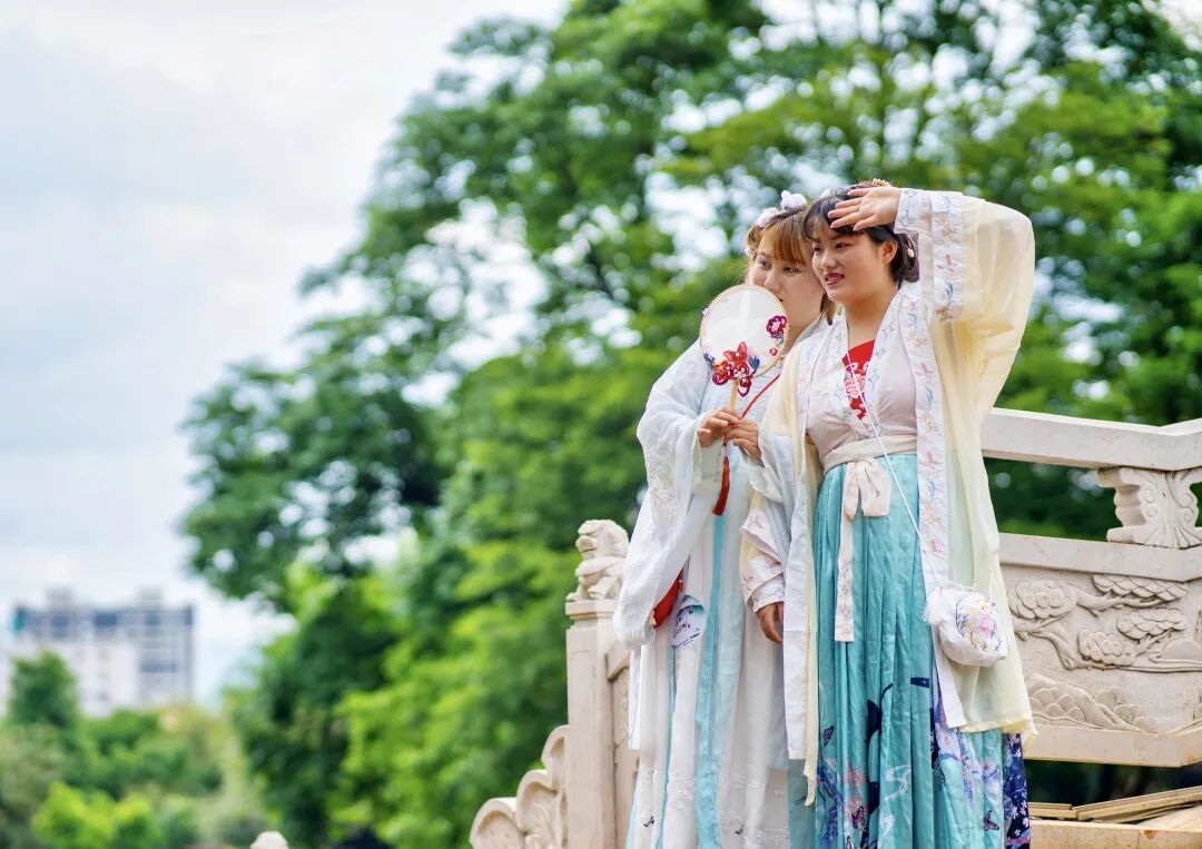 各式汉服虽形色各异,但神韵一脉,汉之素朴、唐之华美、宋之清雅、明之端庄,中华风骨在清丽的裙裾间流淌,绝代芳华搅动了水城初夏,惊艳了游人,也惊艳了时光。