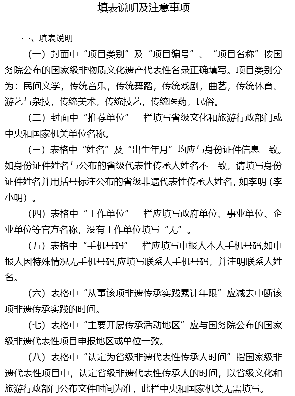 推荐申报材料应突出申报人的代表性和影响力、授徒传艺和掌握核心技能艺能情况,确保真实准确,如发现隐瞒事实、伪造材料等情况,则取消参评资格。
