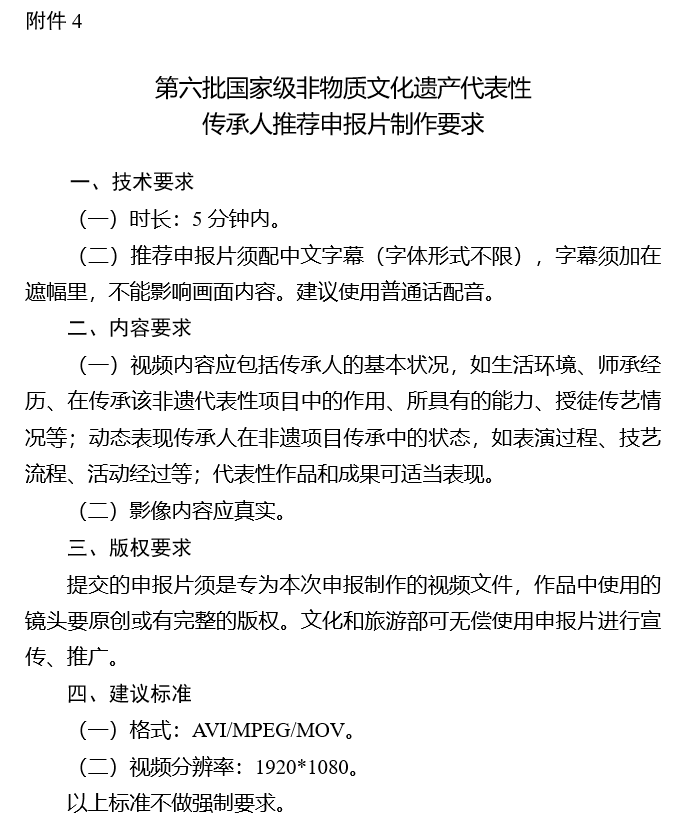 4.第六批国家级非物质文化遗产代表性传承人推荐申报片制作要求