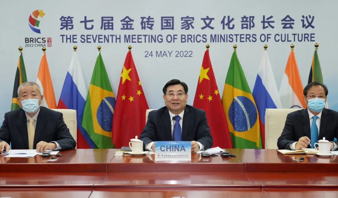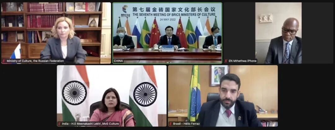 5月24日,第七届金砖国家文化部长会议以视频方式举行。中国文化和旅游部部长胡和平主持会议并发表主旨讲话,巴西旅游部副部长埃里奥·费拉斯·奥里维拉,俄罗斯文化部部长奥莉佳·柳比莫娃,印度文化部国务部长米纳克希·莱希,南非体育、艺术和文化部部长纳西·姆特特瓦出席会议。本次会议以“构建包容互鉴的文化伙伴关系”为主题,各国部长围绕推动文化领域数字化发展与合作、进一步加强文化遗产保护与合作、持续推进金砖国家文化交流平台建设等议题进行深入交流。会上,各方共同签署《落实〈金砖国家政府间文化合作协定〉行动计划(2022—2026年)》。