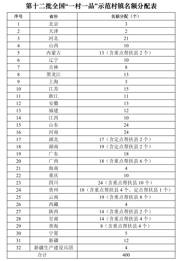 省级农业农村部门按照第十二批全国“一村一品”示范村镇分配名额组织申报推荐。