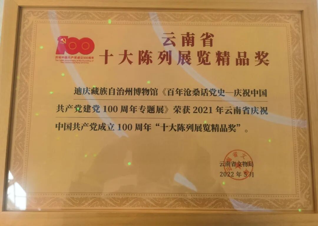 近日,在云南省2022年“5·18国际博物馆日”系列宣传活动启动仪式现场,宣布了云南省庆祝中国共产党成立100周年“十大陈列展览精品”,由迪庆州博物馆策划推出的《百年沧桑话党史——庆祝中国共产党成立100周年专题展》获此荣誉。