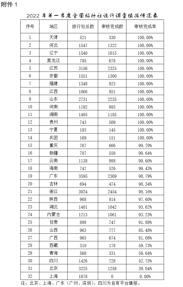 截至2022年3月31日,第一季度全国旅行社总数为42604家,第一季度全国旅行社统计调查数据审核完成率为84.97%。全国26个地区数据审核完成率高于全国水平。其中,天津、河北、辽宁、黑龙江、江苏、安徽、福建、江西、山东、河南、湖南、贵州、宁夏、兵团的审核完成率达到100%。(详见附件1)受新冠肺炎疫情影响,上海未填报一季度统计数据。