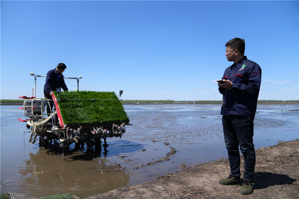 在北大荒集团建三江分公司七星农场有限公司万亩稻田边,农机手陆向导连续轻触两下手机,一台带有北斗导航系统的无人驾驶插秧机开始作业。