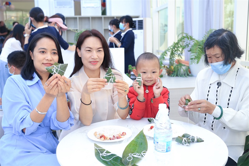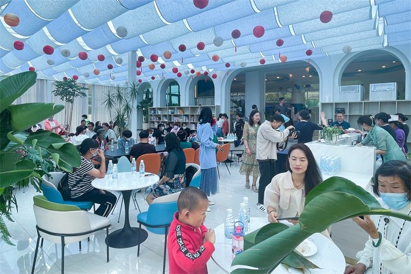 6月3日早上,在寒武纪小镇展示中心,游客络绎不绝,包粽子、品茶歇,举家欢聚,邻里相亲,共度一场美好的传统佳节。领粽叶、浸糯米、包粽子、馅料中加入新鲜肥美的小龙虾,或咸香鲜美的云腿肉,亲手包出自己喜欢的形状,这样的粽子吃起来一定格外香甜。包粽之余,端午茶会同步开启,一边闲聊话家常、一边悠闲品茶,享受端午假日时光。