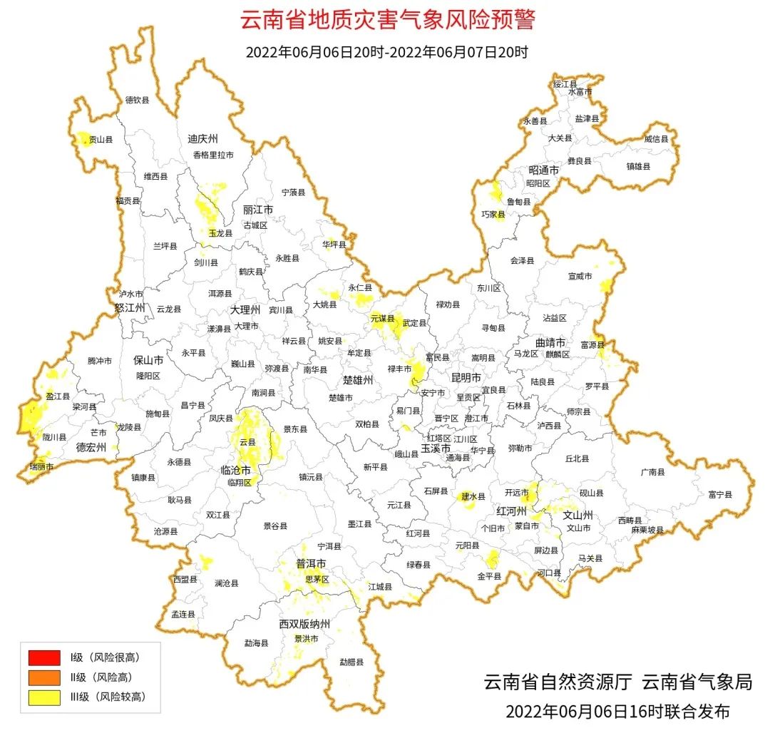 气象部门预计,6月6日20时至6月7日20时,昭通西南部、曲靖东部、文山南部、红河中部和南部、玉溪南部、楚雄北部和东部、丽江西部和东南部、大理北部、普洱中南部、临沧东北部、德宏西部、怒江北部地质灾害气象风险等级为Ⅲ级(风险较高),其中建水西南部、开远东南部、元谋东部、盈江西部、瑞丽局部、贡山局部地质灾害气象风险等级为Ⅱ级(风险高),可能出现滑坡、泥石流和崩塌等地质灾害,请注意防御。