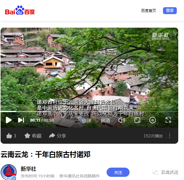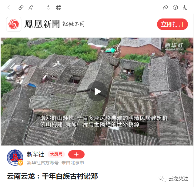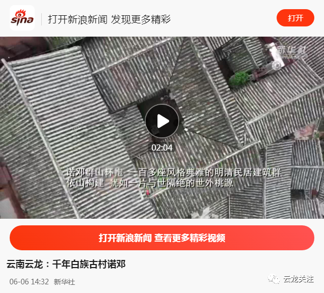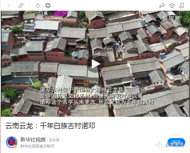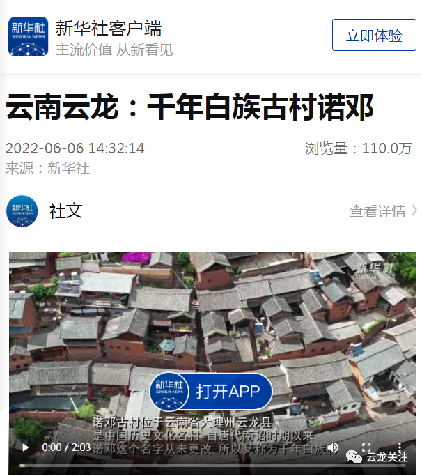 近日,《云南云龙:千年白族古村诺邓》的视频相继在新华社客户端、新华社视频、凤凰新闻、新浪新闻、百度等多平台播出,视频上线一天仅新华社客户端浏览量就达110万。