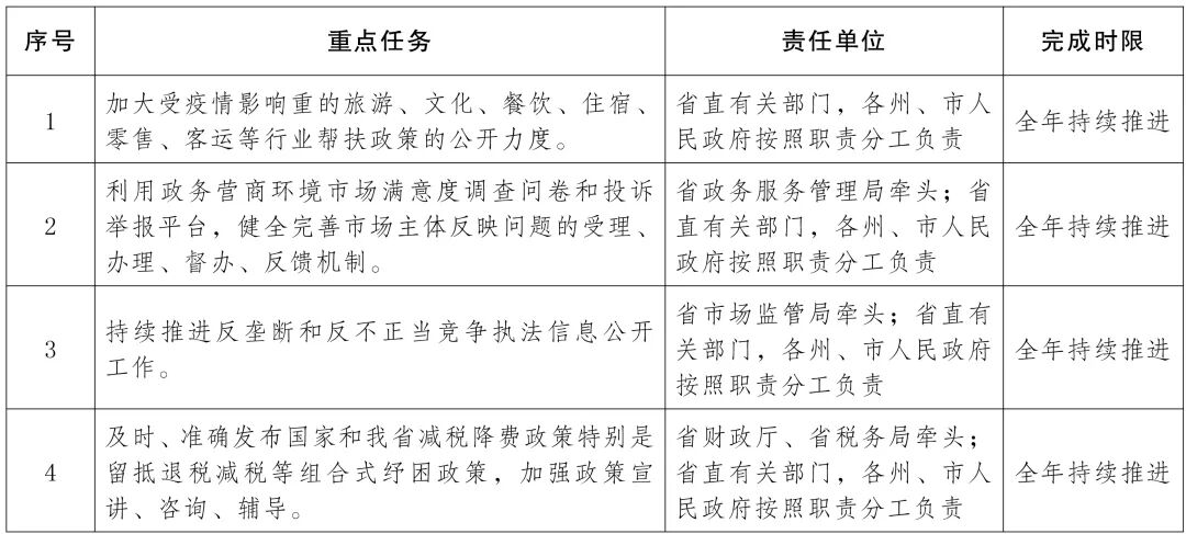(一)加强涉及市场主体的信息公开。增强政策制定实施的透明度和可预期性,推动已出台政策尽快落实到位,提振市场主体信心。加大受疫情影响重的旅游、文化、餐饮、住宿、零售、客运等行业帮扶政策的公开力度,促进稳就业和消费恢复。利用政务营商环境市场满意度调查问卷和投诉举报平台,健全完善市场主体反映问题的受理、办理、督办、反馈机制,助力优化营商环境。持续推进反垄断和反不正当竞争执法信息公开工作,为各类市场主体规范健康发展营造诚信守法、公平竞争的市场环境。