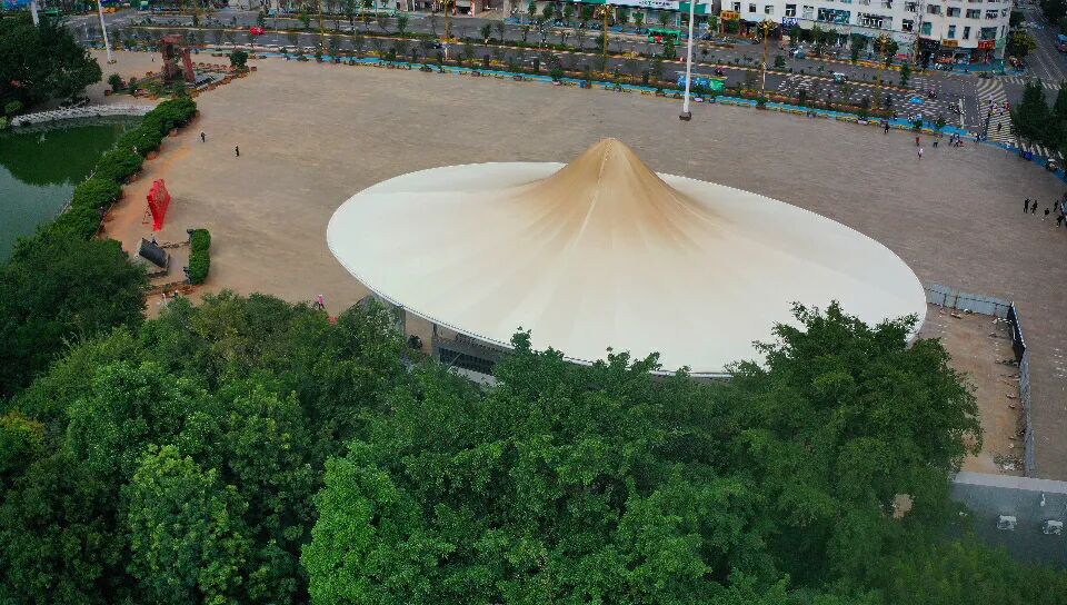 这座艺术感十足的建筑是易门正在建设中的龙泉文化广场舞台改造提升项目。新建的舞台长47米,宽27米,高21米,舞台顶部以易门四大名菌之一的“鸡枞菌帽”为元素设计,采用钢膜结构建造而成;台柱为“菌根”造型,台基立面用钢雕的龙纹图案装饰,多角度呈现“滇中水城·菌乡易门”的城市文化。