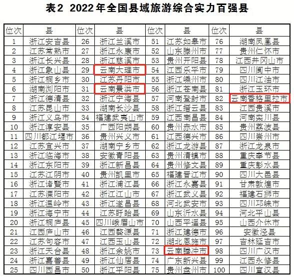 《全国县域旅游研究报告2022》显示,2022年全国县域旅游综合实力百强县分布在19个省区市。具体分布为:浙江占35席,四川占10席,贵州、江苏、江西均占9席,湖南、云南占4席,福建占3席,安徽、河北、河南、山东、山西、重庆均占2席,甘肃、广东、广西、湖北、吉林各有1席。前十强中,浙江表现突出,占7席,湖州安吉县连续4年位居全国县域旅游综合实力百强县榜首。