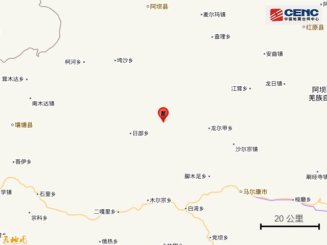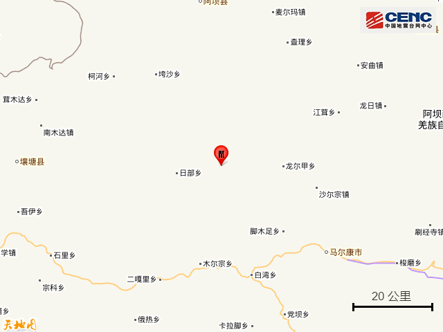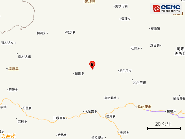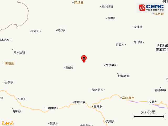 周边县城:震中距马尔康市55公里、距阿坝县71公里、距壤塘县79公里、距红原县89公里、距金川县91公里,距阿坝藏族羌族自治州56公里,距成都市280公里。