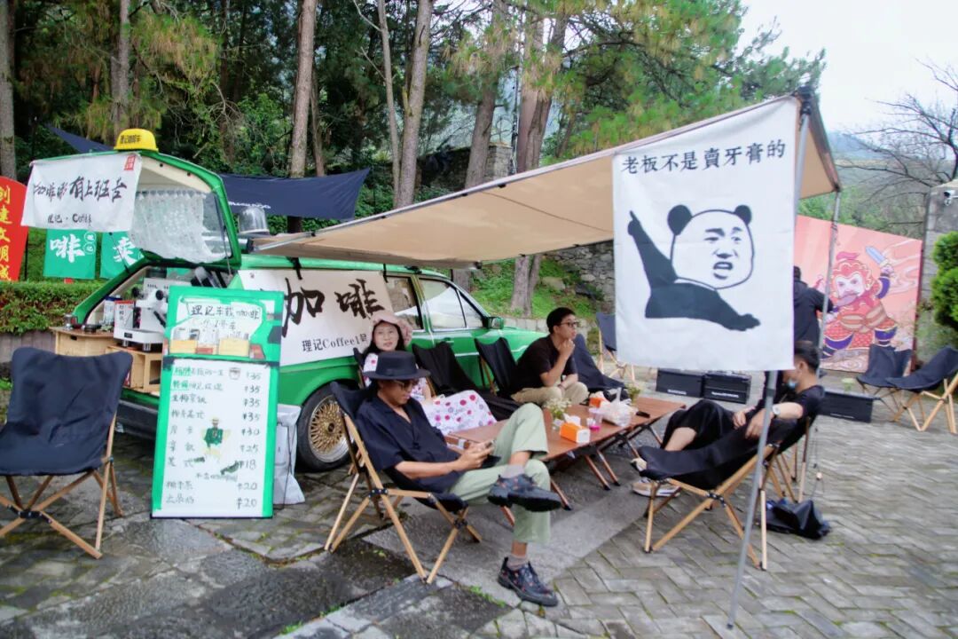 一辆车,后尾箱是咖啡小吧台,旁边有几张露营小桌椅、一两顶白色帐篷……