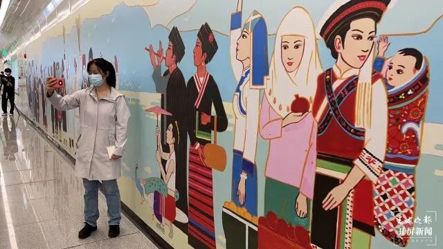 该站艺术文化墙以文化瓷砖为媒材,以云南省26个世居民族以及周边风景滇池和西山为主要表现内容,色彩丰富、肌理多变,呈现了云南省的丰富多样民族文化特色,表达了各民族团结、进步、安居乐业、热情好客的主题。
