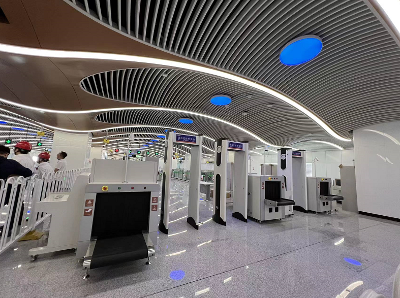 通过采用丰富的色块组合和线条的连接来体现民族的融合和团结。车站顶部中央的块状铝板斜向错落拼接,搭配色彩和灯光的变化,使空间充满活跃和韵律的变化,寓意着民族的团结编织出彩色的祥云,顶部两侧的彩色线条连接了墙面和顶面,使整体空间一气呵成,同时也象征着民族团结的凝聚力。