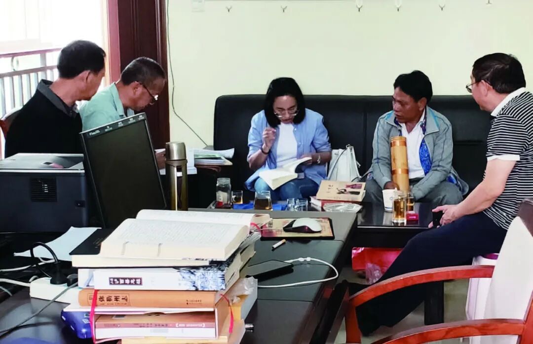 (彝学专家龙倮贵(左三)、李金发(左二)、平慧(左一)指导《莫棉巴》编写)