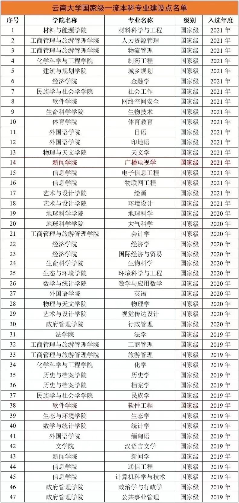 近日,教育部办公厅发布了《关于公布2021年度国家级和省级一流本科专业建设点名单的通知》,云南大学18个专业入选第三批国家级一流本科专业建设点,云南大学新闻学院广播电视学专业名列其中。至此,云南大学新闻学院的新闻学、广播电视学两个本科专业均成为国家级一流本科专业建设点,标志着云南大学新闻学院本科人才培养工作进入新阶段,为学院发展注入了新动力。