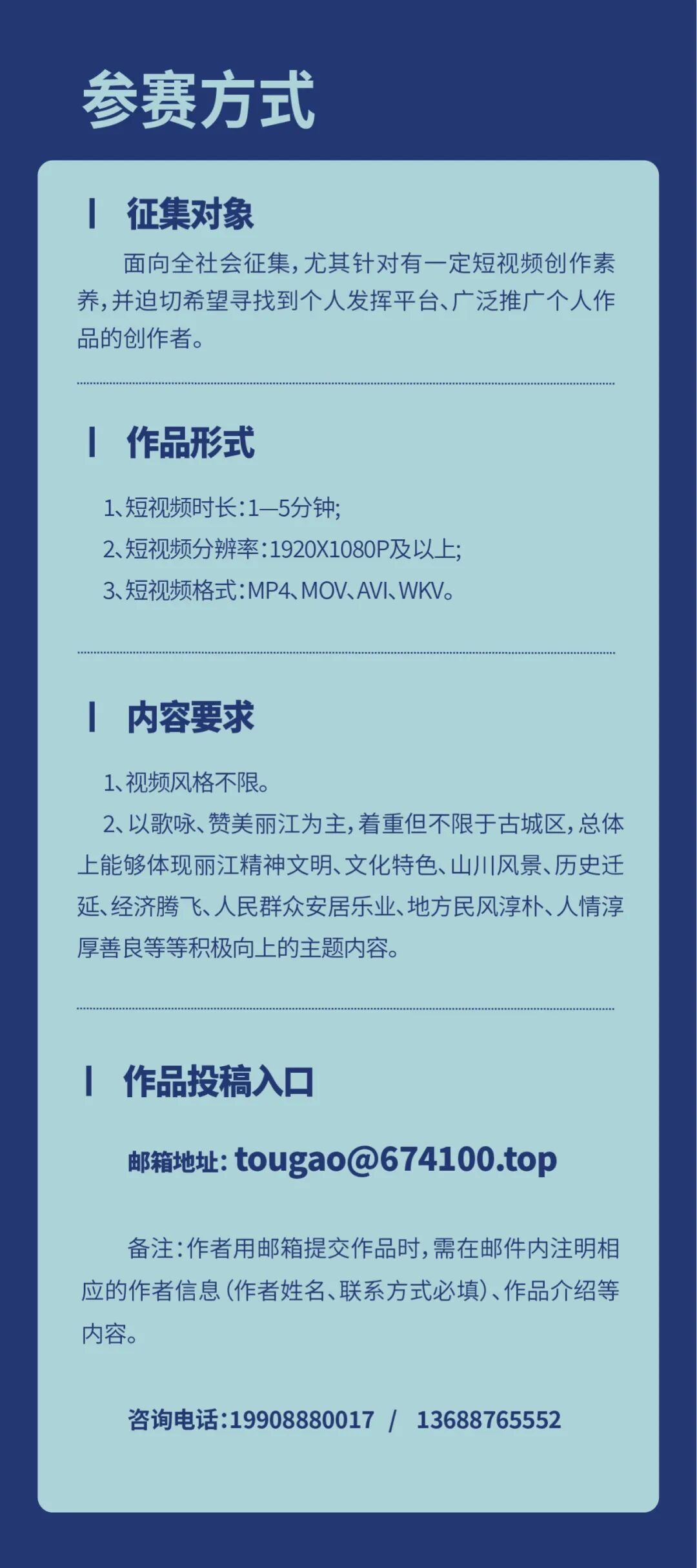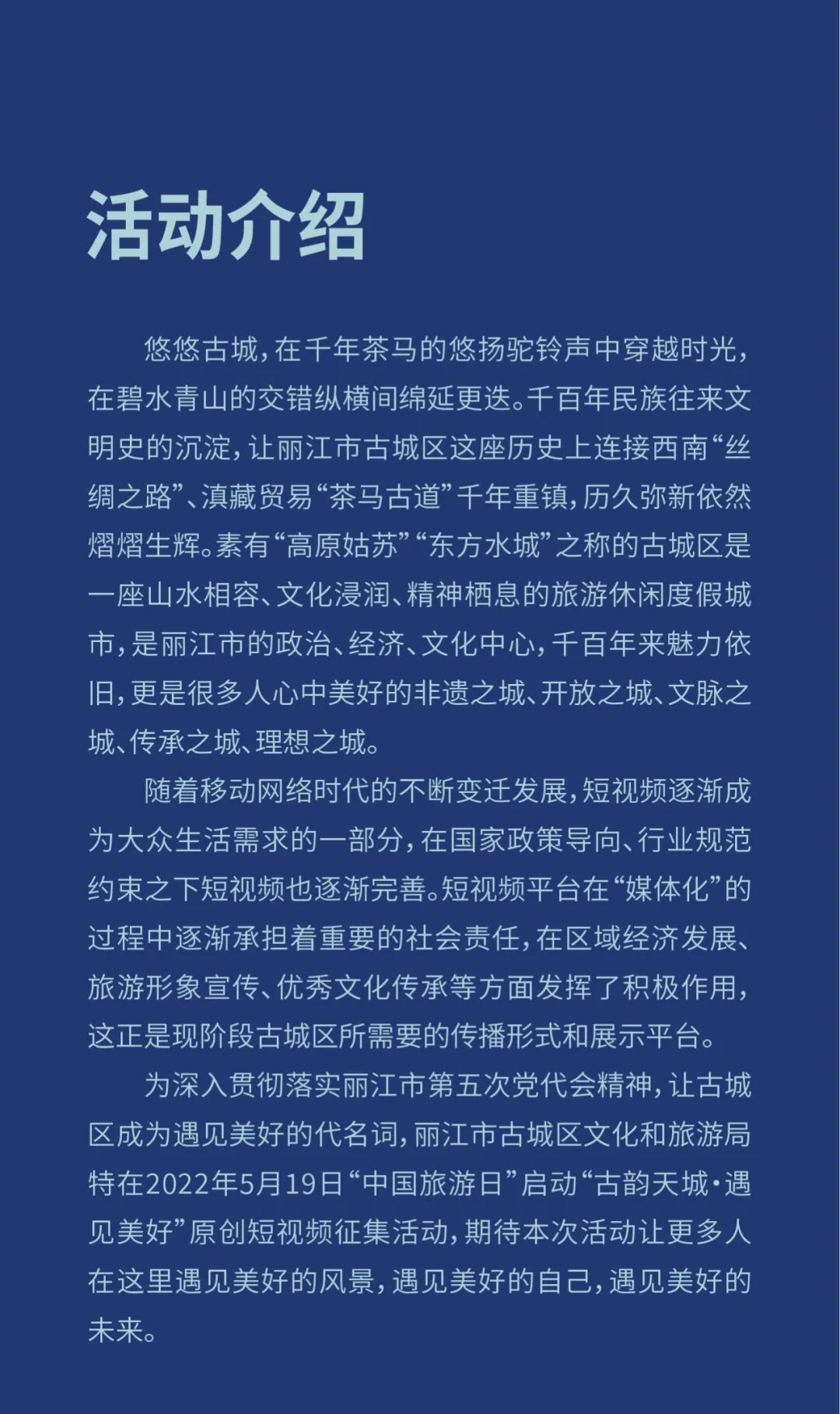 为深入贯彻落实丽江市第五次党代会精神,让古城区成为遇见美好的代名词,丽江市古城区文化和旅游局推出了“古韵天城·遇见美好”原创短视频征集活动,面向全社会征集以歌咏、赞美丽江为主,着重但不限于古城区,总体上能够体现丽江精神文明、文化特色、山川风景、历史迁延、经济腾飞、人民群众安居乐业、地方民风淳朴、人情淳厚善良等积极向上的内容为主题的短视频。奖励丰厚,赶快来参与!