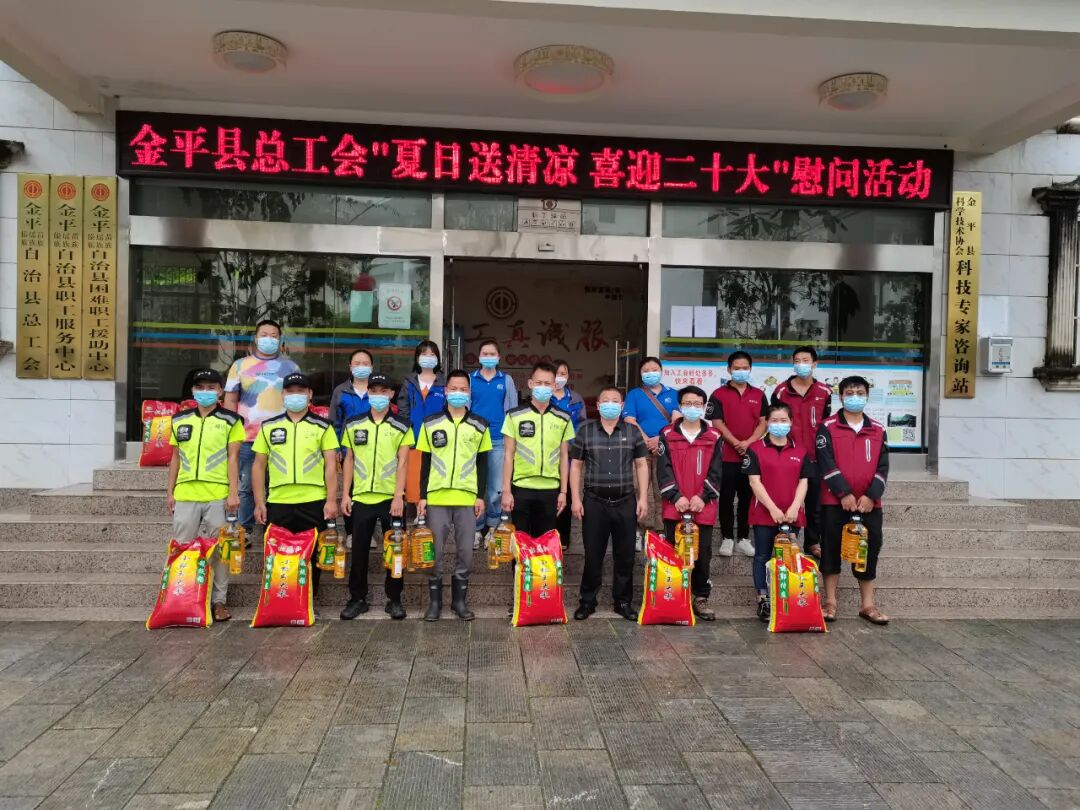 金平县总工会集中慰问了长期从事户外劳动和高温作业的快递员、外卖送餐员等新就业形态劳动者,为他们送去大米等生活物资。