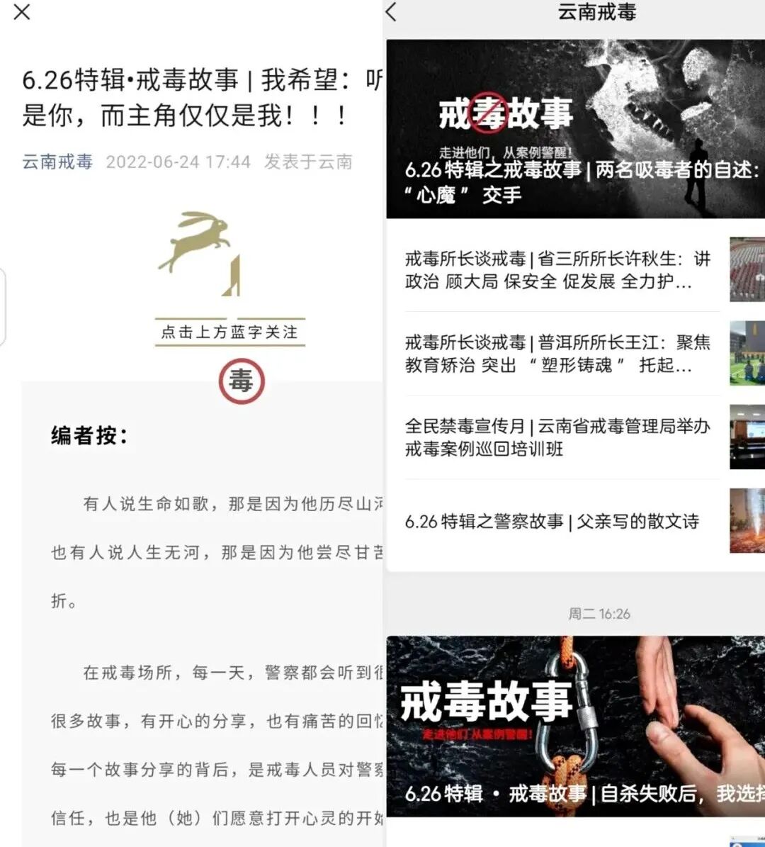 云南省戒毒管理局在“6.26“国际禁毒日期间在云南戒毒微信公众号开辟戒毒故事专栏,以戒毒人员为主角,讲述自己曾经与毒品的故事,推出一批兼备教育意义和警示意义的戒毒故事,让禁毒戒毒普法宣传走进大众、服务群众、影响公众,提高人民群众识毒、防毒、拒毒能力,营造全社会共同关心、共同支持、共同参与戒毒工作的浓厚氛围。