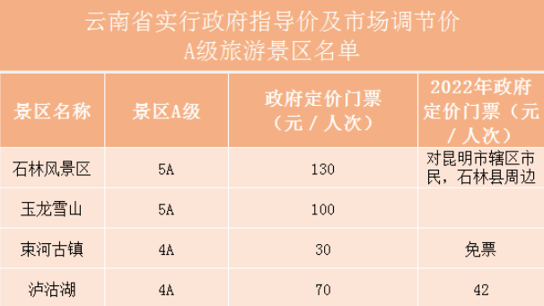 根据云南省《2021年旅行社云南旅游产品参考成本消费提示》,结合“2022年实行政府指导价及市场调节价A级景区名单”计算得出: