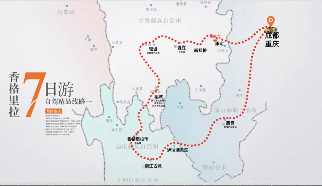 第一条线路从成渝出发,主要经过康定市、雅江县、理塘县、稻城县、香格里拉市、丽江古城、泸沽湖、西昌市。
