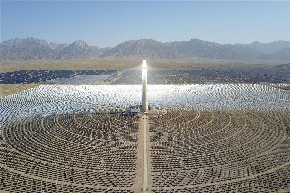这是2022年6月8日在青海省海西蒙古族藏族自治州德令哈市光伏(光热)产业园拍摄的青海中控德令哈50兆瓦光热电站(无人机照片)。新华社记者 范培珅 摄
