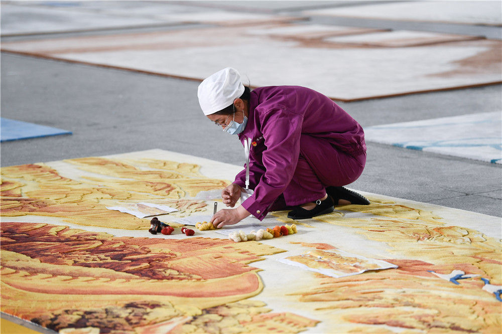 2021年6月7日,在青海圣源地毯集团有限公司生产车间内,工人在制作藏毯。新华社记者 张龙 摄