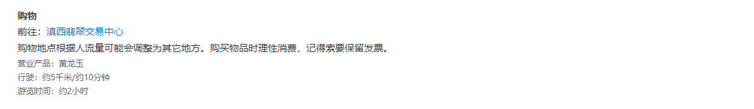 2022年7月4日,监测到名称为“云南昆明+大理+丽江6日5晚跟团游”的旅游产品,包含“滇缅玉石(翡翠、银器)、滇西翡翠交易中心(黄龙玉)”两个购物点。