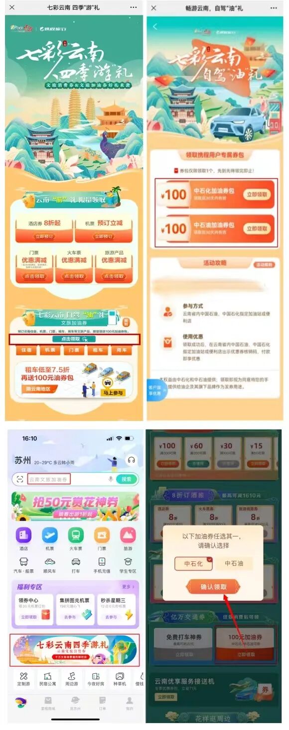 省文化和旅游厅联合中石油、中石化两家油企,通过“携程”“同程”线上平台,于7月5日开始发放第二批次第二轮加油券3100万。每份自驾游加油券总额100元。其中包含:满200减20元汽油券(4张)、满50减20元便利店非油通用券(1张),加油券自领取之日起,15天内有效。领取自驾游加油券的游客需在“携程”“同程”平台完成1项文旅产品的消费、预订(住宿、景区门票、旅游演艺、机票、自驾游租包车)即可触发加油券领券。