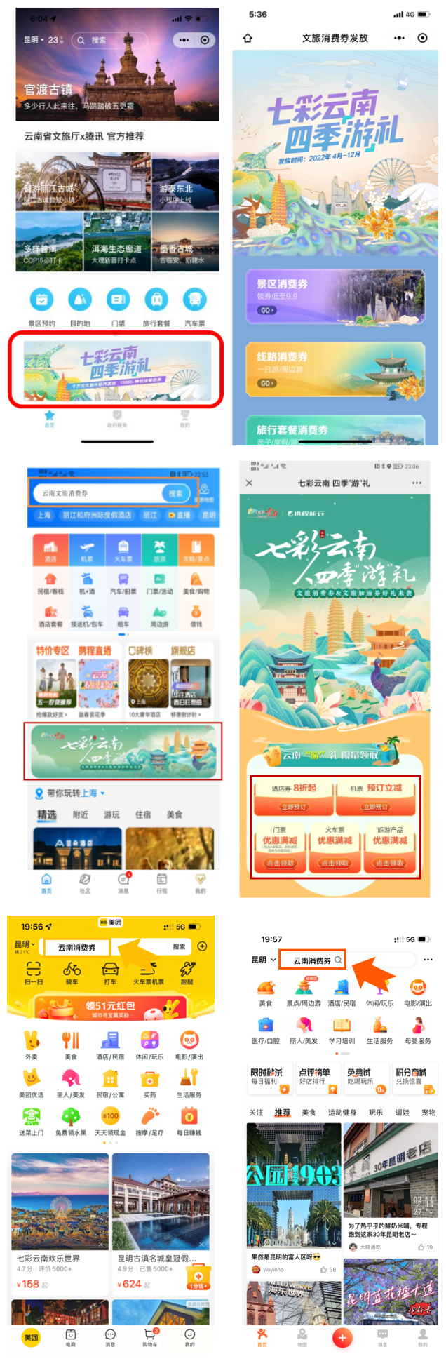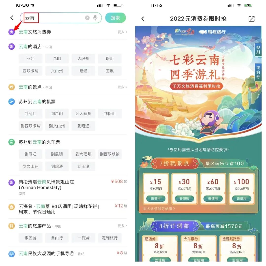 文旅消费券发放活动与文旅加油券同期进行,省文化和旅游厅将通过“游云南”“携程”“美团”“同程”四家线上平台,于7月5日开始发放第二批次第二轮文旅消费券8000万。本次活动涵盖旅游景区、旅游住宿、旅游演艺休闲、旅游交通、旅游线路产品等文旅消费领域。本次文旅消费券分为“通用文旅消费券”和“专用文旅消费券”两种券型,其中通用文旅消费券主要在A级旅游景区、旅游演艺休闲、温泉与主题乐园等使用;专用文旅消费券可在OTA平台购买公共交通(机票/高铁票/火车票)、旅游线路产品、民宿酒店住宿产品时使用,根据不同的产品设计多种消费面额,在使用过程中,可与商家优惠叠加使用。文旅消费券自领取之日起,七天内有效。