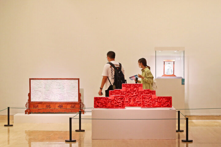 7月4日,由中国美术馆、北京工美集团有限责任公司主办的“匠心传承——工艺美术大师精品展”开幕。本次展览分为“玉雕凝翠色”“雕漆绽红颜”“花丝携彩霞”“内画藏天地”四个部分,共展出6位艺术家近年所创制的60件作品,作品形式包括玉雕、雕漆、花丝镶嵌和内画。(来源:中国旅游新闻客户端)