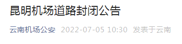 因渝昆高铁长水机场段施工,自2022年7月4日封闭受施工影响的机场南路(环港东路至东二路段)。