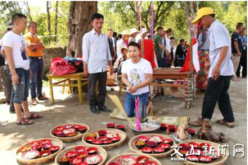 20日上午在马关县城安平广场迎宾客,吹迎宾大号,唱迎客歌,敬迎客酒。宾客需要经过一个古老而神秘的“上刀山下火海”祝福通道。牛王庇佑“布依人”,寓意为感谢牛对布依族的救命之恩情,并祈求“牛王”保佑所有布依同胞富贵平安。
