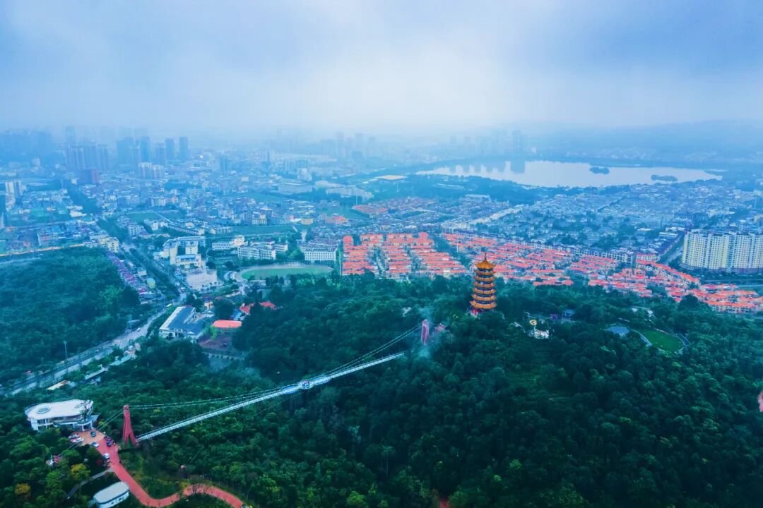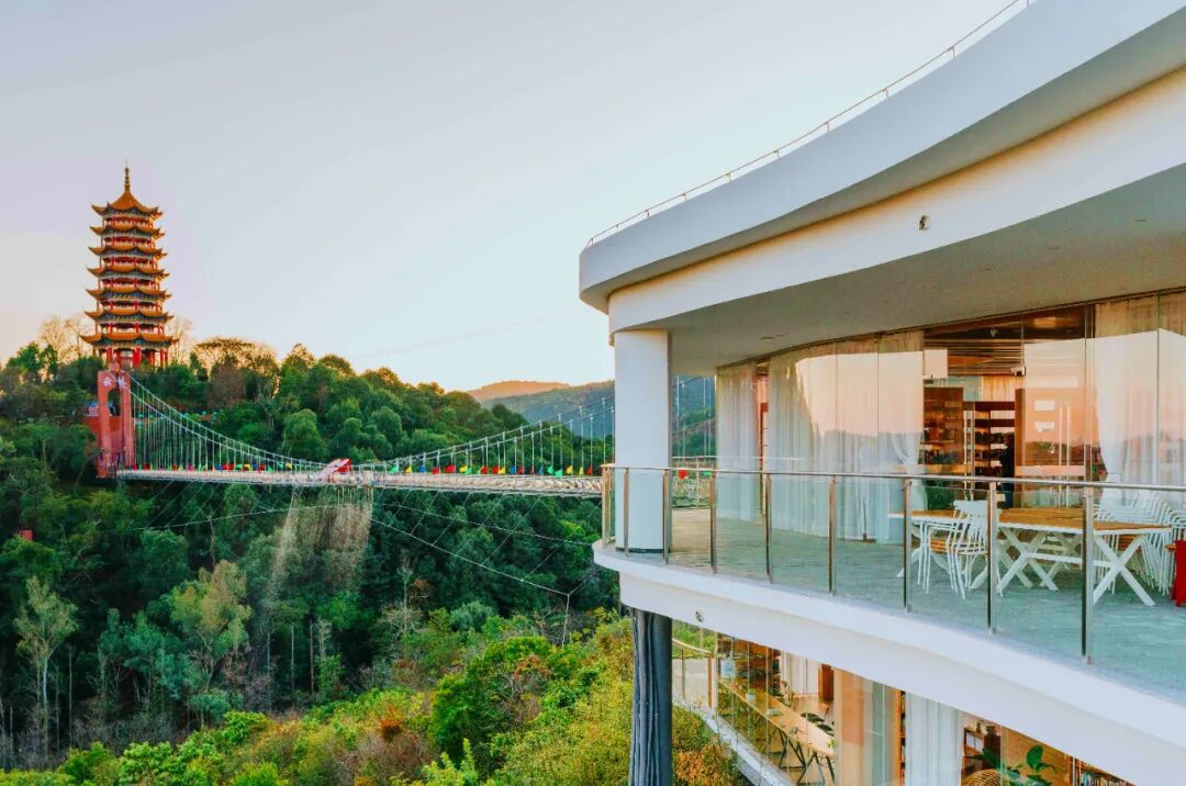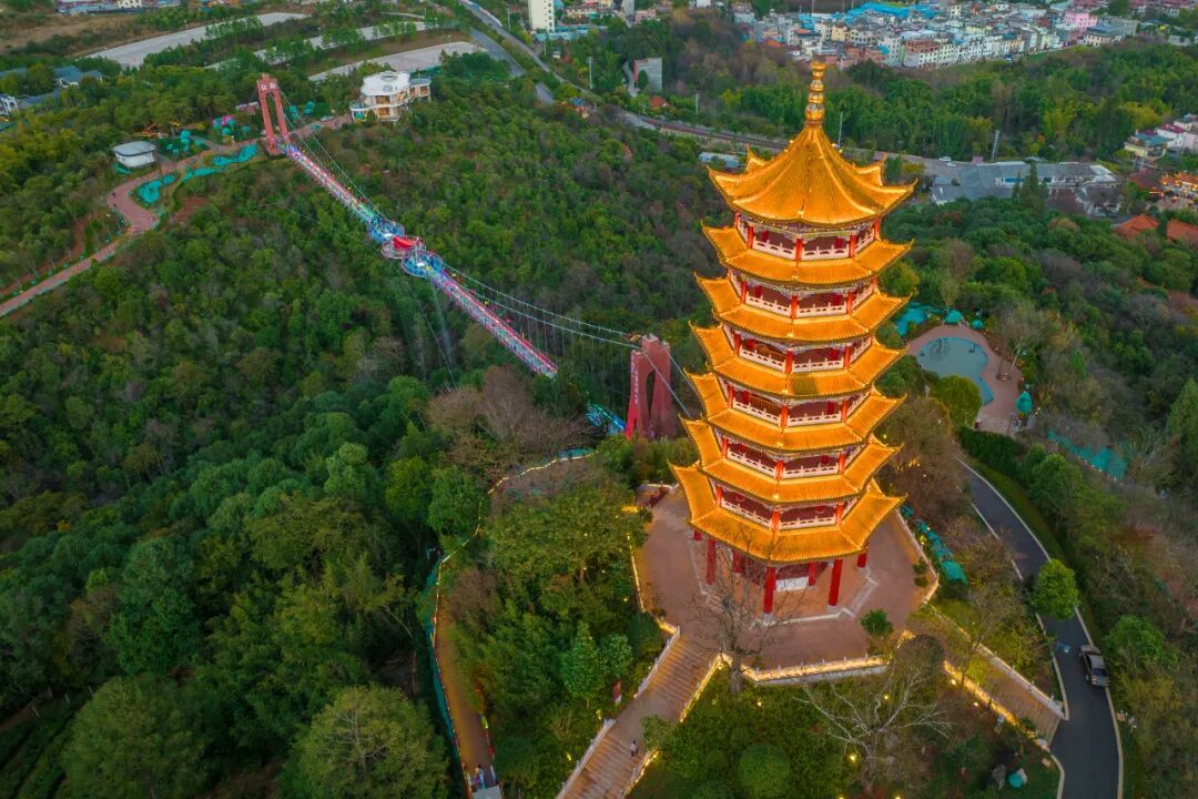 其中,髯翁森林公园的空中廊桥为人行观光玻璃桥,又名“云桥”,长约233.44米,最大高度落差99米。玻璃观光平台充分利用地势条件连接两座山体,作为城市之中的“景观高地”打造,具有“历史与现代的穿越”意义。通过景观设施和灯光亮化等,使造型呈“水幕”状,风格与周边环境相协调,与锦屏山风景区隔空相应。居于桥上,弥勒城全景尽收眼底。桥面最大游客容量约为500人,如今这里也成为弥勒旅游的地标建筑。