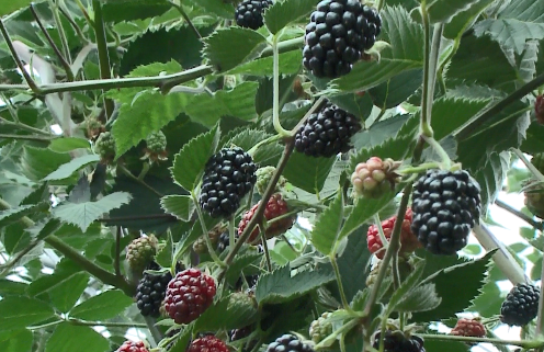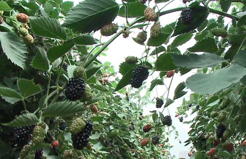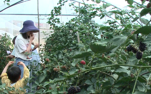 “黑树莓的话,它前期是绿色的,中期是红色的,刚转色的,有点偏酸,如果你喜欢吃酸的话,可以摘生一点。 成熟度好的话,它是又水又甜的,非常适合采摘。”尹长国说。