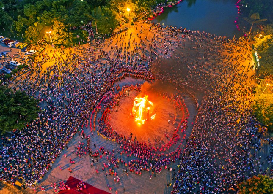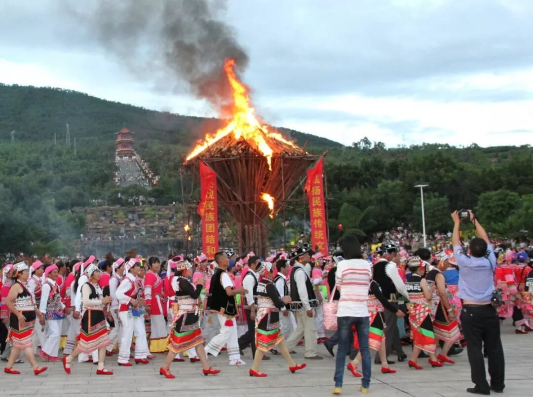 活动内容:磨盘山烽火台取回的火种传递至民族广场,彝族大毕摩举行传统祈福仪式后点燃主场圣火。
