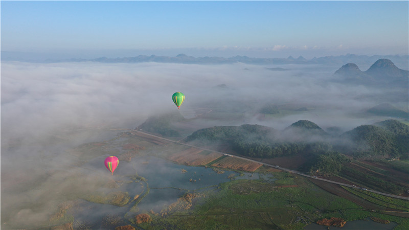 在文山可以用最潮的方式赏玩山水:在普者黑乘坐热气球、在广南体验低空旅行,从半空俯瞰水乡田园、湖泊峰林被光影绘成一副水墨丹青。千年古村落、绚丽多姿的民族文化尽显民族团结和谐之美。科技赋能旅游发展的新产品、新业态,普者黑首个沉浸式夜游主题项目“荷风夜拾光” 用高科技结合地域文化,讲述天上人间穿越时空的爱恋,提升了景区的文化内涵和艺术表现力,丰富了游客的旅游体验。