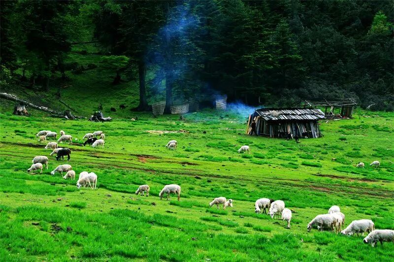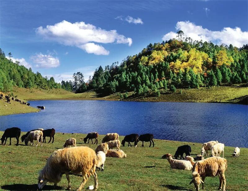 大羊场。大羊场地处大湾子山近处,东面是玉龙雪山、哈巴雪山,茫茫山丘之间望过去,银光闪耀在远远的高山顶;西面看碧罗雪山,一条飞舞的“银蛇”,挂在高山峡谷当中,千里绵延,气势磅礴;向北遥望,是白茫雪山、梅里雪山的伟岸身姿,大羊场在坝子的中心,宽广、辽阔,是一派诗情画意。