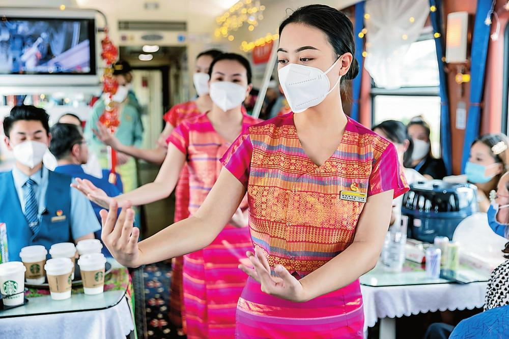 (“坐着火车游云南”首趟旅游专列上,乘务员为旅客表演老挝舞蹈。陈畅 摄)