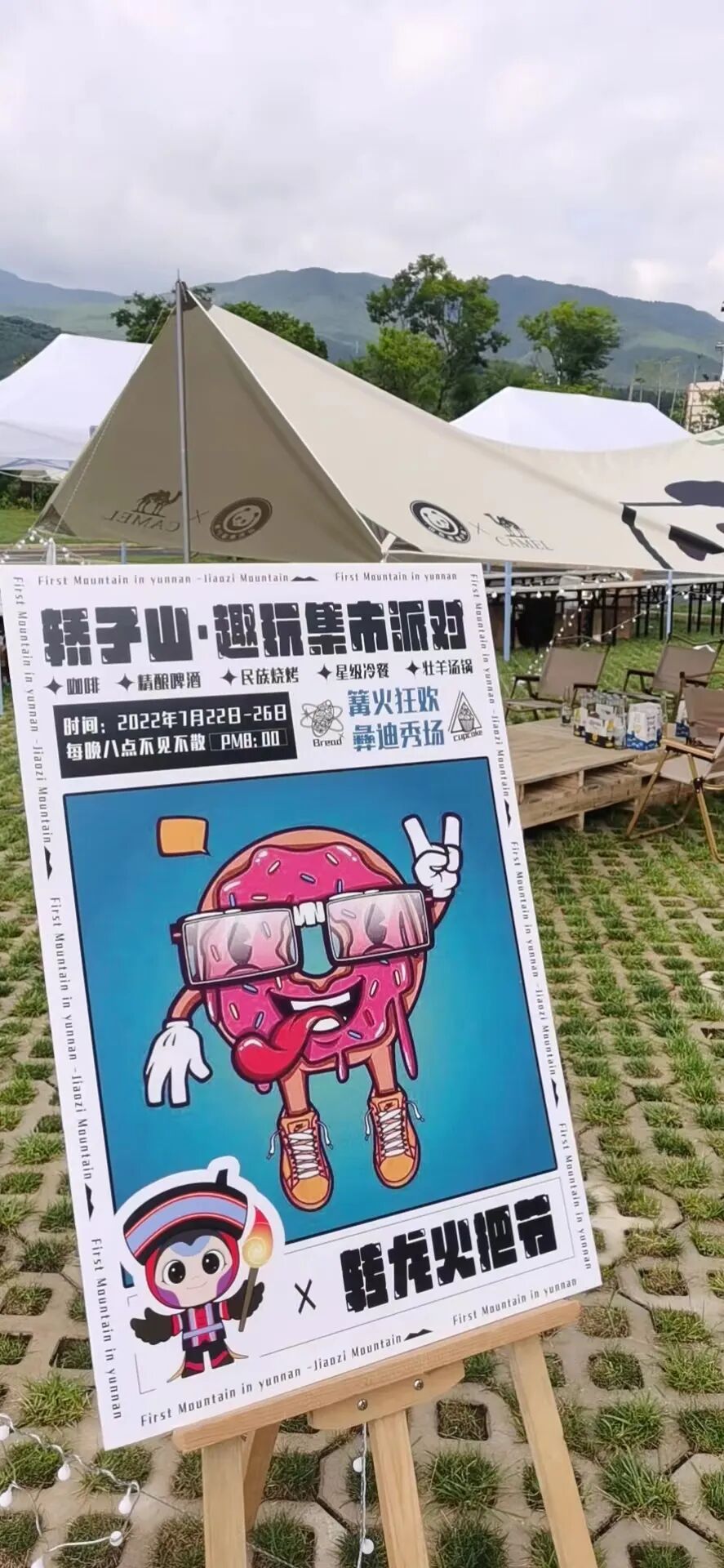 在这个帐篷露营基地,分设有篝火晚会区、露天电影放映区、后备箱市集区、露营装备展示区、天幕餐饮区(各种冷餐、炒菜、啤酒、烧烤等美食供应)等不同的功能区域。