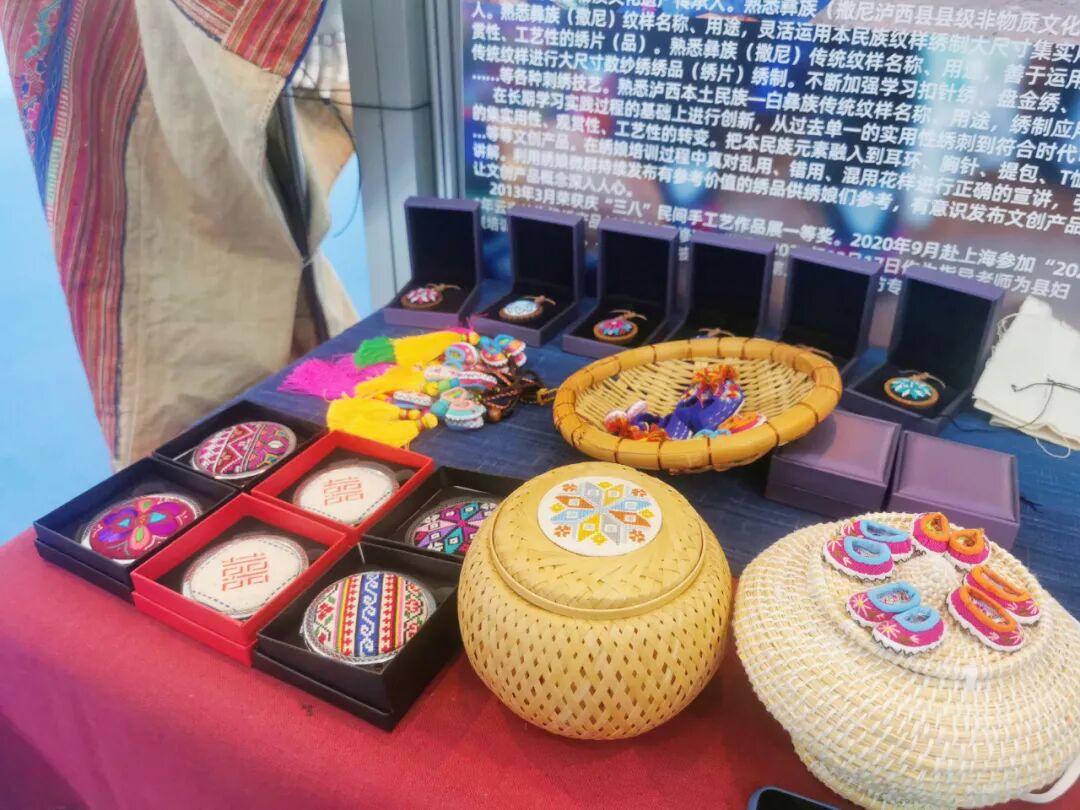 红河州在旅游消费馆中共设有个14个标准展位进行产品展销,参展产品包括建水紫陶、个旧锡工艺品、彝族苗族刺绣、弥勒云南红葡萄酒、哈尼古树茶、梯田红米、石屏豆制品等。此外,弥勒东风韵小镇、建水西庄紫陶特色小镇等设立了独立展位,宣传推介名家作品及文创精品。