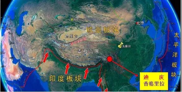 (印度板块与亚欧板块碰撞示意图,图中红色圆圈为迪庆位置)