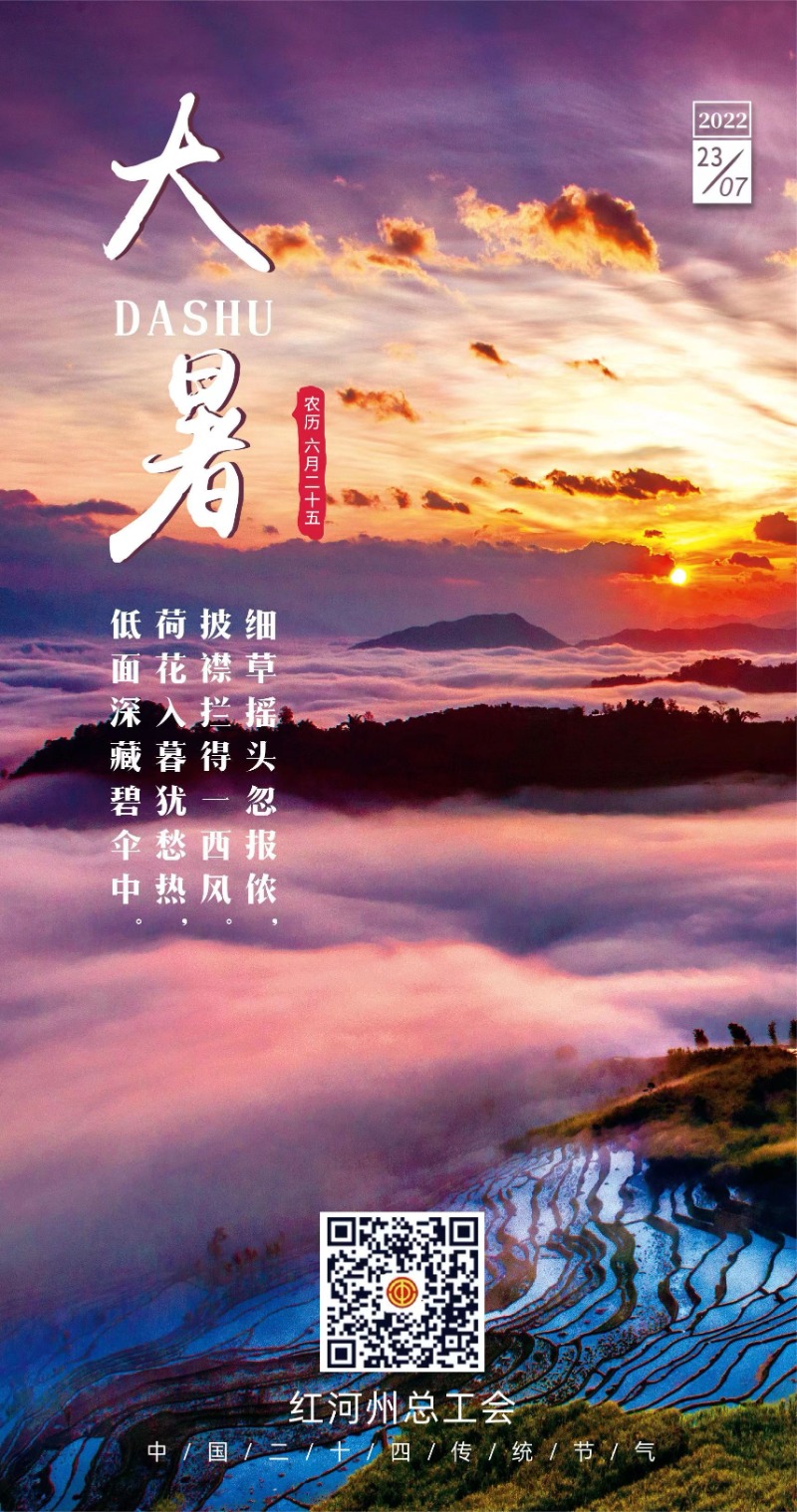 大暑 ©原创 2022-07-23 13:19 0 大暑 夏季最后一个节气 暑热至盛 祝你满怀热情 尽情绽放 挥洒汗水 不负韶华 文旅头条融媒体记者 伍迪 文 海报设计 郭磊锡 见习编辑 韩艳慧 审核 李亚 张敏