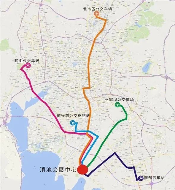 旅交会期间,5条定制直达线路从昆明市眠山公交车场、北市区公交车场、巫家坝公交车场、前兴路公交枢纽站、南部客运站等5个方向直达滇池会展中心,具体线路为: