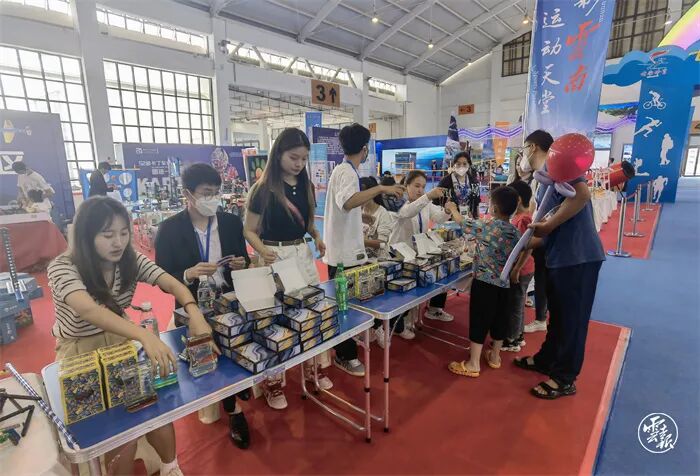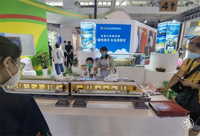 展示的火车模型、铁路文创产品和坐着火车有云南展板,见证云南铁路的发展历程。