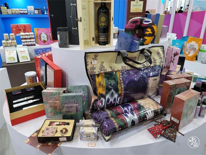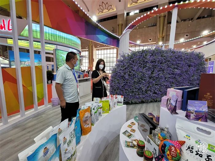 进入新疆展区,一面薰衣草花墙,把人直接带入最美的伊犁。新疆展区的旅游展板集中展示了新疆各地的绝美自然风光,让游客大饱眼福。在外围的展柜上,纸皮核桃、葡萄干、红枣、牛肉干等一系列特产,让游客大饱口福。