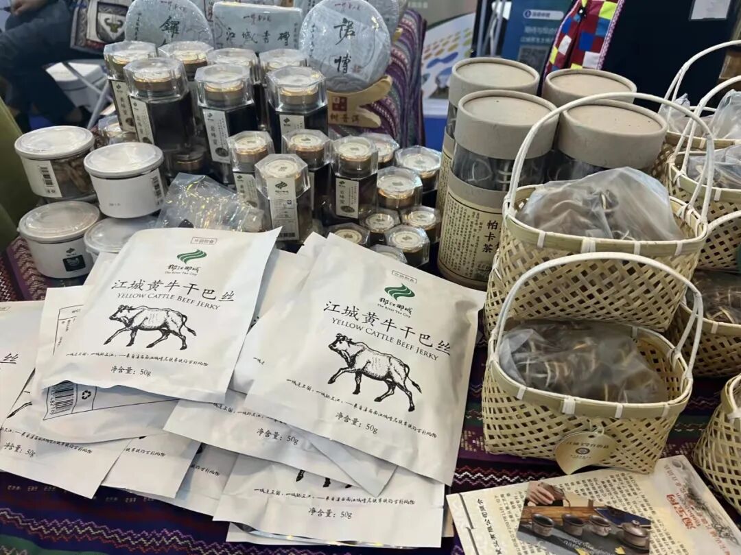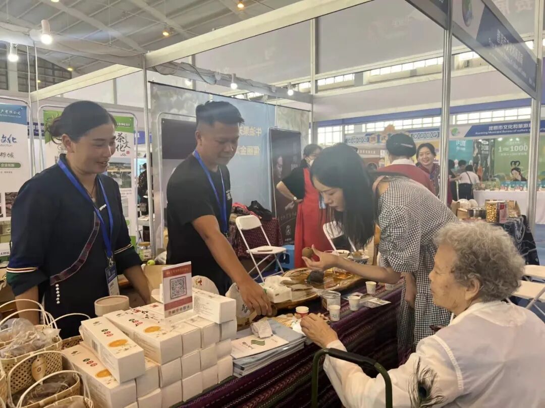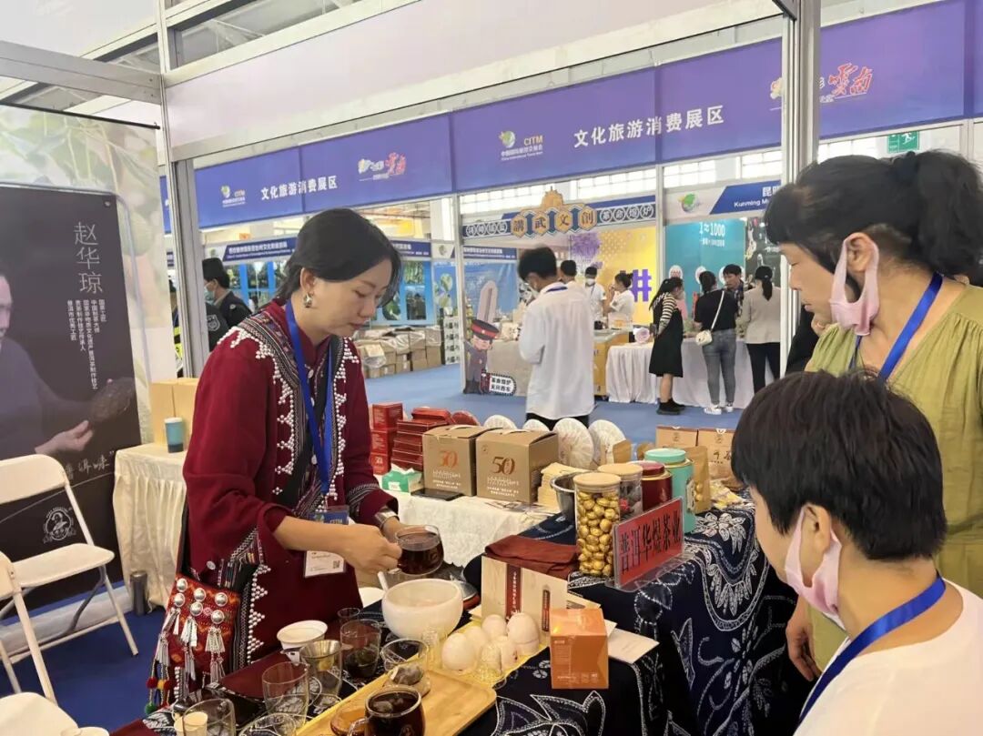 在江城原生土特产有限公司的茶叶和农特产品展台前,可以看到来逛展的市民和少数民族姑娘小伙一起唱《敬茶歌》,一起品尝普洱茶,负责人蔡浩丽热情地分享黄牛干巴让大家试吃,在普洱的民族文化中真诚推介了产品,让大家对普洱旅游产生了向往,在蔡浩丽的感染下,怒江、曲靖等少数民族参展商也被吸引,前来共同唱民族歌曲,展示商品。蔡浩丽说:“来旅交会,售卖产品不是目的,重要的是推荐我们普洱的文化,交流学习。”