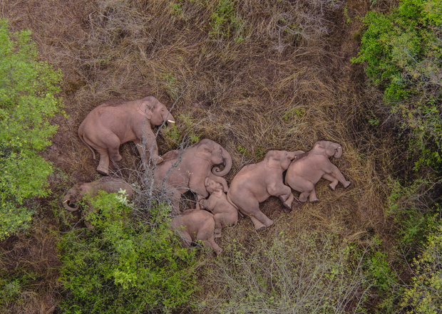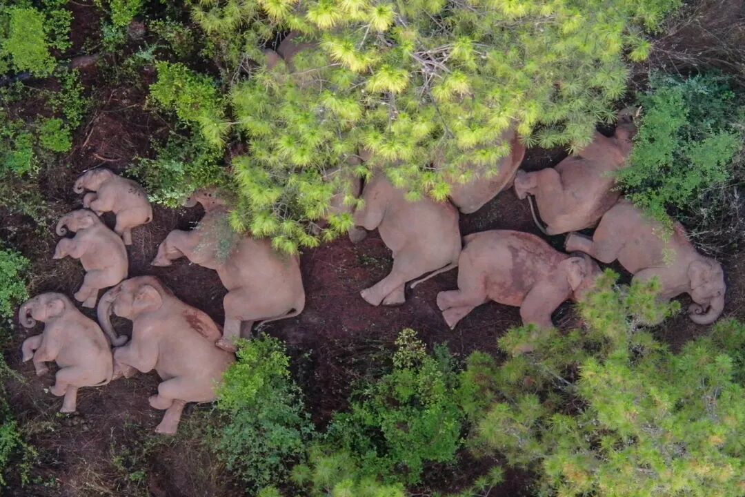 (象群在云南省玉溪市易门县十街乡休息 新华社 图)