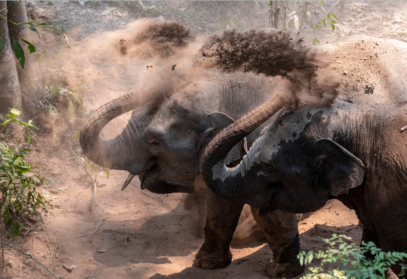 (两头野生亚洲象在野象谷森林里洗沙浴 新华社 图)