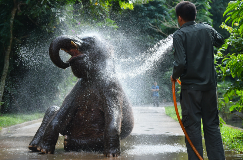 (亚洲象“小强”享受淋浴 新华社 图)